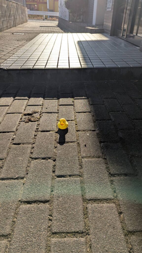 さて冷蔵庫の中も品薄なので午前中のうちに買出しに、とエントランスから駐車場へ出ようとすると、今度はなぜかプラスチックのアヒルがぽつねんと。どこぞの部屋のお子さんの砂場道具からの落とし物か何かだろうか。買い物から戻ってもまだそこにあって、夕方の整体から帰ってもまだそこで置き去りだったら連れ帰ってうちの風呂場チームに加えてやるかと思ったら、その時間には無事持ち主に、かどうかは不明だがとりあえずは回収された模様。