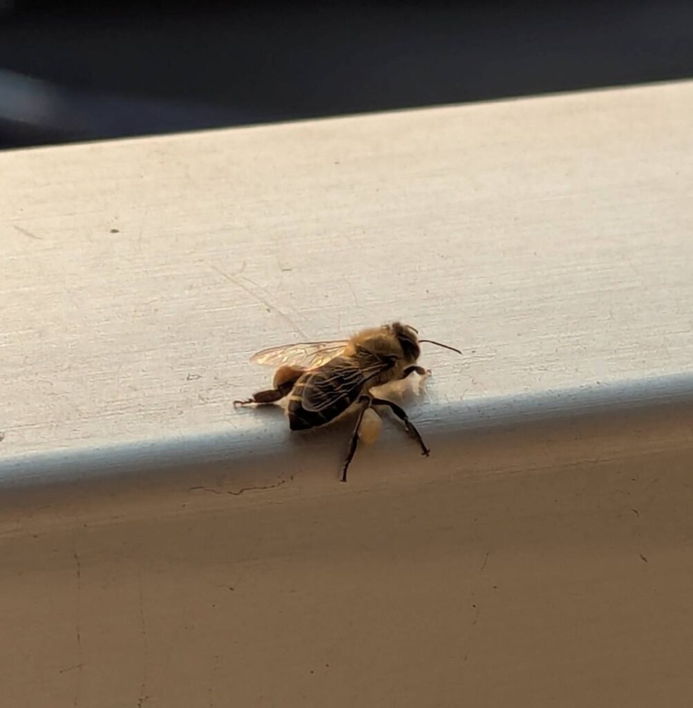 週明けての朝、先日柿のヘタが乗っていたのとほぼ同じ場所にミツバチが一匹身じろぎもせず。しばらくして部屋から窓の外を見た時にはもういなかった。